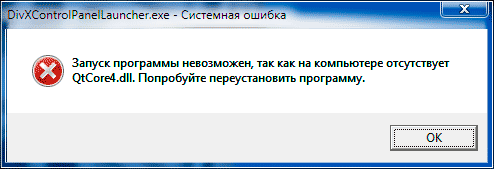 Можно попробовать поправить эти пути в реестре; [HKEY_LOCAL_MACHINE\SOFTWARE\DivX\Install\ControlPanel] "InstallDir"="С:\\Program Files\\DivX\\DivX Control Panel" "InstallPath"="C:\\Program Files\\DivX\\DivX Control Panel\\DivXControlPanelLauncher.exe" [HKEY_LOCAL_MACHINE\SOFTWARE\DivX\Install\Qt4.5] "InstallDir"="C:\\Program Files\\Common Files\\DivX Shared\\Qt4.5" [HKEY_LOCAL_MACHINE\SOFTWARE\DivX\Install\MSVC80CRTRedist] "InstallDir"="С:\\Program Files\\Common Files\\DivX Shared" Суть проблемы в том, что DivXControlPanelLauncher.dll не находит путь к папке Qt4.5, где находится файл QtCore4.dll. На x86 такой проблемы нет, а в x64 необходимо учитывать особенности внесения записей в реестр. |