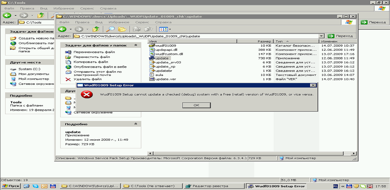 Скажите пожалуйста, какие именно msi-пакеты из GRMWDK_EN_7600_1.ISO отвечают за сабж? Помогите с установкой сабжа на живую систему. Нахимичил я че-то с этими установщиками из wcoinstallers_cab001.cab... Установил полный msi-пакет wcoinstallers, так почему-то установился только user-mode driver framework, причем старой версии (WudfPf.sys и WudfRd.sys - 6.0.5716.32). Хотя kernel-mode распакованный оттуда же установился нормальной версии - 1.9.7600.16385.0 Чуть позже нашел вроде бы нормальный, нужный, wudf но он поверх старой (видимо) не хочет устанавливаться. Скрин ошибки во вложении. |