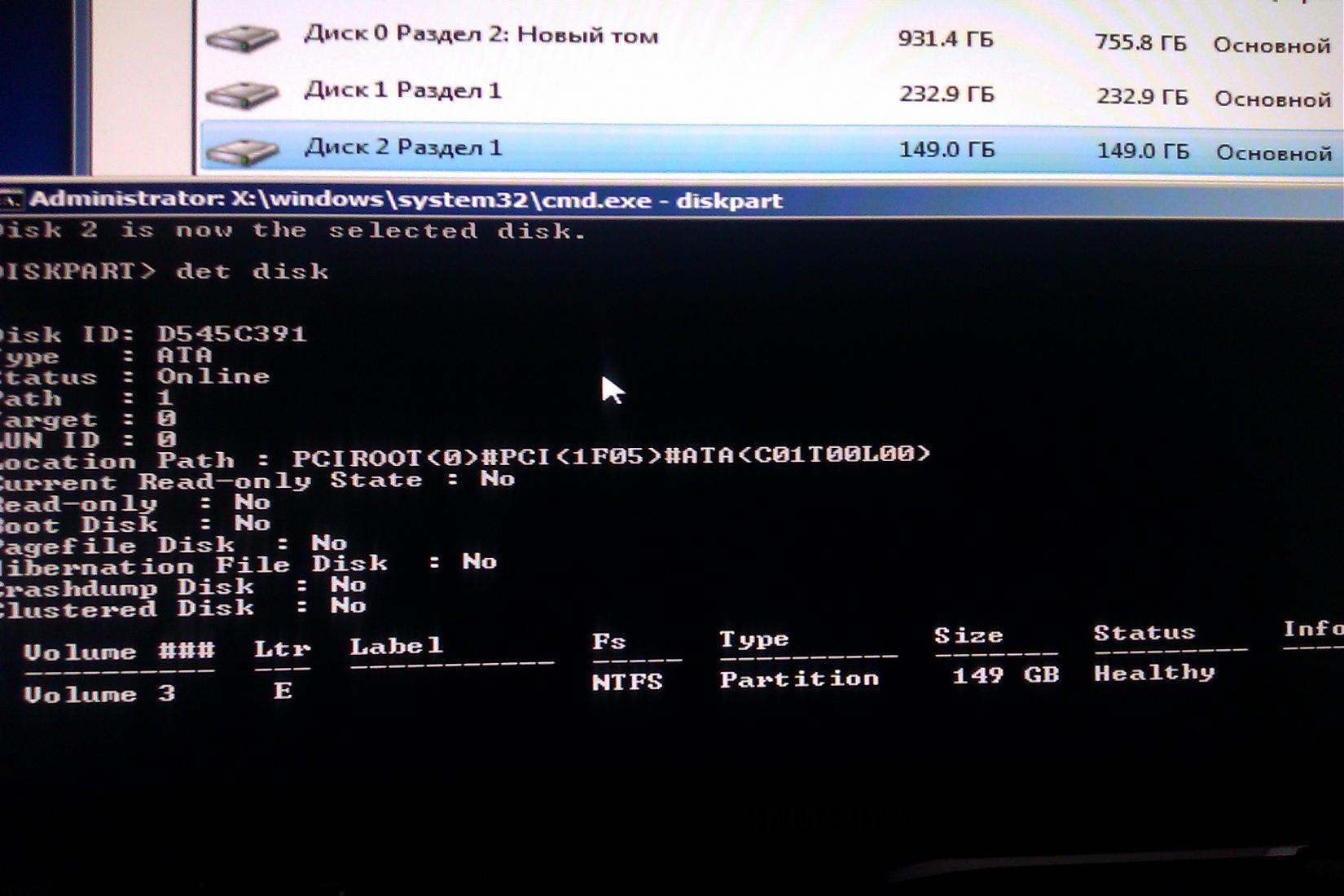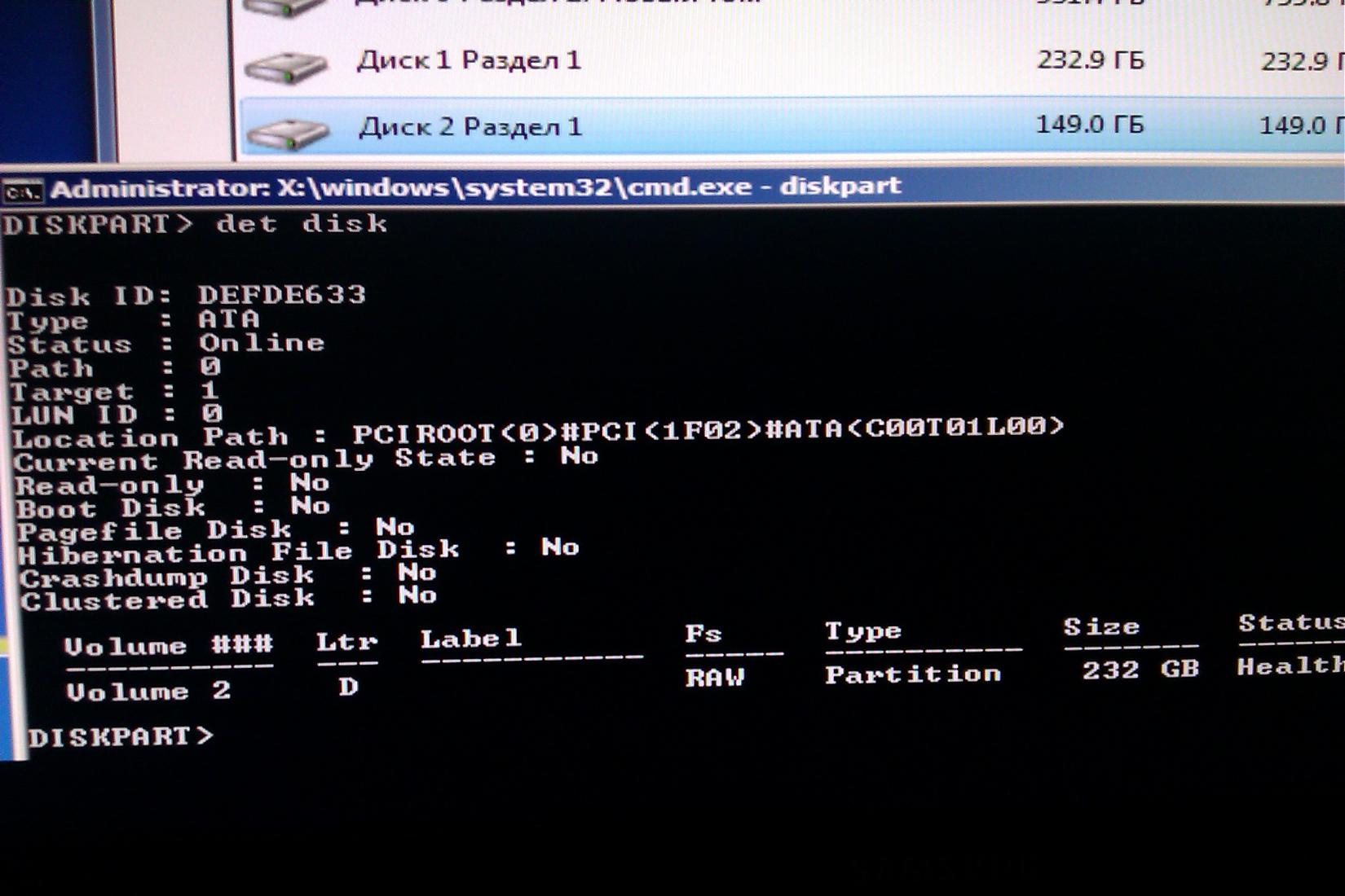 Картина на фото после прохождения этапов: Diskpart List disk Sel disk (1 и 2) List part Clean Установить не получается! |