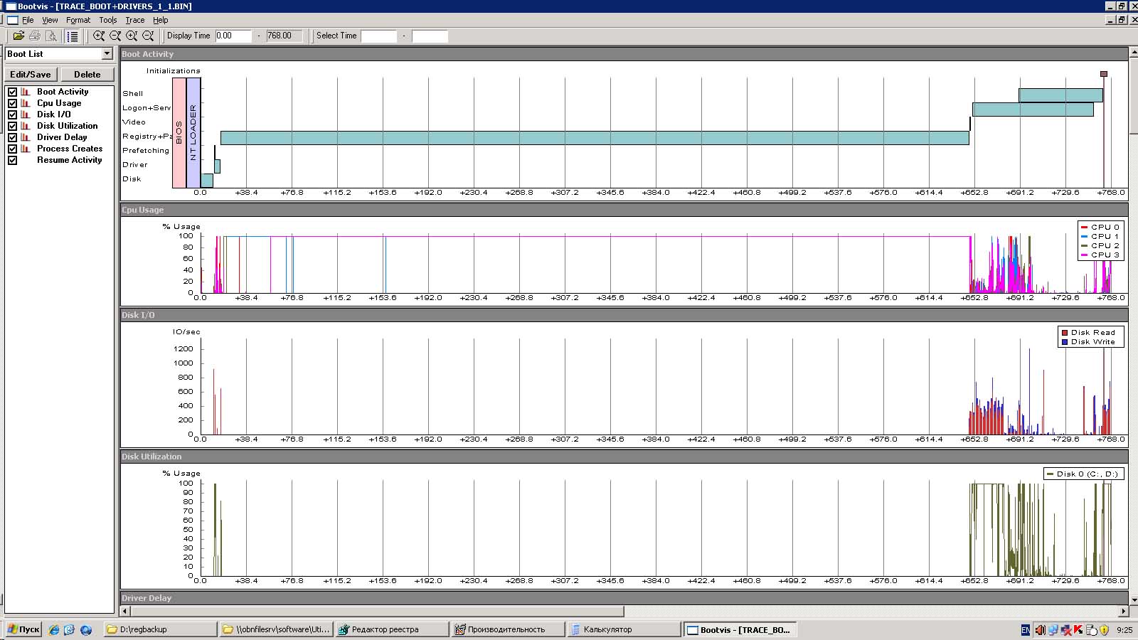 Долго грузится сервер (роутер). Пр загрузке происходит следующее: 1. Проходит тест стартовый экран BIOS, начинает грузиться ОС (черный экран с Windows 2003 и бегающей строкой), 2. после этого черный экран без курсора, висит минут 15, индикатор монитора зеленый, в стендбай не уходит, активности диска нет. На этом этапе обычно экран голубой и проходят сообщения "подготовка сетевых соединений" и т.п. 3. Потом отвисает и сразу приглашение "нажмите ctrl-alt-del" и "сбой при запуске как минимум одной службы" В журналах ошибок нет, диск тестил, битых секторов нет. Видео встроенное, поставил pci-e, без изменений. Из домена выводил/вводил, не помогло. с LiveCD грузится нормально. Службы после загрузки смотрел -те, что авто, работают. Как выяснить что за таймаут такой и как узнать на какую службу ругается? OC - WinSrv 2003 R2, ISA2006, Конфиг железа: Core i3, Gigabyte GA-H55M-USB3, 2*2ГБ оперативки Kingston Hyper-X DDR3-1333 Прилагаю скриншот MS BootViz, может по нему можно что то сказать? Вижу там 100% загрузки CPU в это время, но чем оно занято? В поиске нашел подобные посты, но там везде черный экран с курсором. |