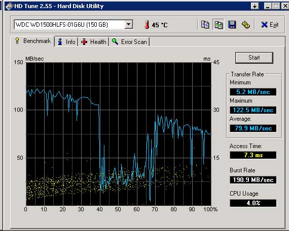 Профиль | Отправить PM | Цитировать Склонировал диск, загрузил с него - пауза с черным экраном осталась, время загрузки на 1 минуту меньше. Посмотрел викторией - секторов с <600 мс нет, HDTune без провалов. Прогнал оба теста с livecd - результат примерно одинаковый.