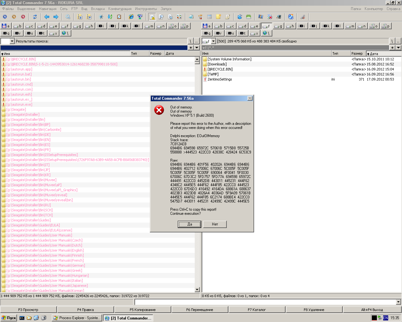 Постараюсь максимально донести суть и обрисовать ситуацию... Есть под завязку забитый всякой-разной всячиной жесткий диск, емкость которого - полтора гигабайта... Этот жесткий диск стал для меня эдаким 'сервером', на который я долгое время, отовсюду, без каких-либо закономерностей и сортировки, складировал всю свою информацию, важную и не очень важную, нужную и не очень нужную - любую, всю полностью... Да и зачем стирать что-либо (при этом еще и тратя время на разбор, что же можно/надо удалить, а что, всё-таки, можно/надо оставить), если есть возможность просто копировать и сохранять всё подряд, ведь имеется такой диск, на котором столько памяти и, что немаловажно, всё может быть сразу, в одном месте... Никогда не знаешь, когда что-то из всего этого, что угодно, может пригодиться (кстати, нередко так у меня и случается)... Но вот, диск заполнен, и теперь, честно, мне легче и проще приобрести новый большой жесткий диск, чем разгрести все эти завалы информации на старом, том, о котором сейчас идет речь... Но... Никто не говорит, что вся эта информация, что на нём, уже не нужна... Более того, я всё время ей пользуюсь, вот только навигация значительно усложнилась, и порой - я трачу довольно не_мало лишнего времени, чтобы найти то, что мне в данный момент времени как раз очень нужно... Я знаю точно, что оно где-то там, на диске, но вот где именно - не могу помнить; ищу, ищу, ищу, психую, ищу; теряю время... и нервы... Казалось бы, ПОИСК в помощь, однако в таком большом объеме данных он производится ооочень долго... Был у меня, скажем так, полу-выход: с помощью Total-Commander'а и его поиска, по шаблону *.* я 'сканировал' информацию на диске и сохранял результат в TXT-файл... Какое-то время это помогало, дальнейший поиск значительно упрощался (и ускорялся)... Но объем информации на моем диске рос, увеличивался размер получаемого текстового файла, и на данный момент, когда пытаюсь сохранить (обновить) этот файл, я получаю ошибку, что во вложении, - не_достаточно ресурсов, слишком много папок и файлов (а сохранение из Total-Commander'а в TXT-файл осуществляется через буфер обмена)... Файл уже ооочень сильно отстал от настоящей реальности, очень далеко... ___ Мне очень нужно решение, не знаю, быть может, программа, что-нибудь, что-угодно, чтобы можно было так же (или, может, как-то по-другому, лучше, эффективнее) сохранять дерево всей информации на диске, но напрямую, сразу в файл... Это главное для меня - сохранить полный список всего содержимого на жестком диске... При этом, чтобы сохранялось максимально большое количество всевозможной доп.информации, такой как: обязательно ПОЛНЫЕ пути к папкам и файлам, размеры, возможно даже хеши (вообще супер)... и т. д., и т. п.... Однако... Есть еще кое что, чего бы мне ооочень хотелось, чего, за то время, пока я пользуюсь своим полу-решением, мне сильно не_хватает... А не_хватает мне одной функции (возможности): чтобы был не просто список содержимого с данными и доп.данными, не просто полные пути к папкам и файлам в виде текста, но гиперссылки к ним, чтобы можно было прям из моего файла нажать на гиперссылку к папке, и открывалась эта папка, а нажав на гиперссылку к файлу - запускался б этот файл... Ребят, я очень надеюсь на Вашу помощь... Нужна хорошая, БЕСПЛАТНАЯ программа... С нетерпением буду ждать ответов... Спасибо большое!.. |