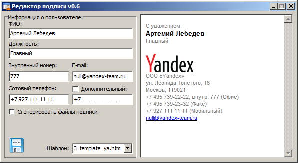 Генерирует файлы подписи в html, rtf, txt и кладет их в папку подписей оффиса. PNG при этом вставляется и остается ссылкой на сайте. |