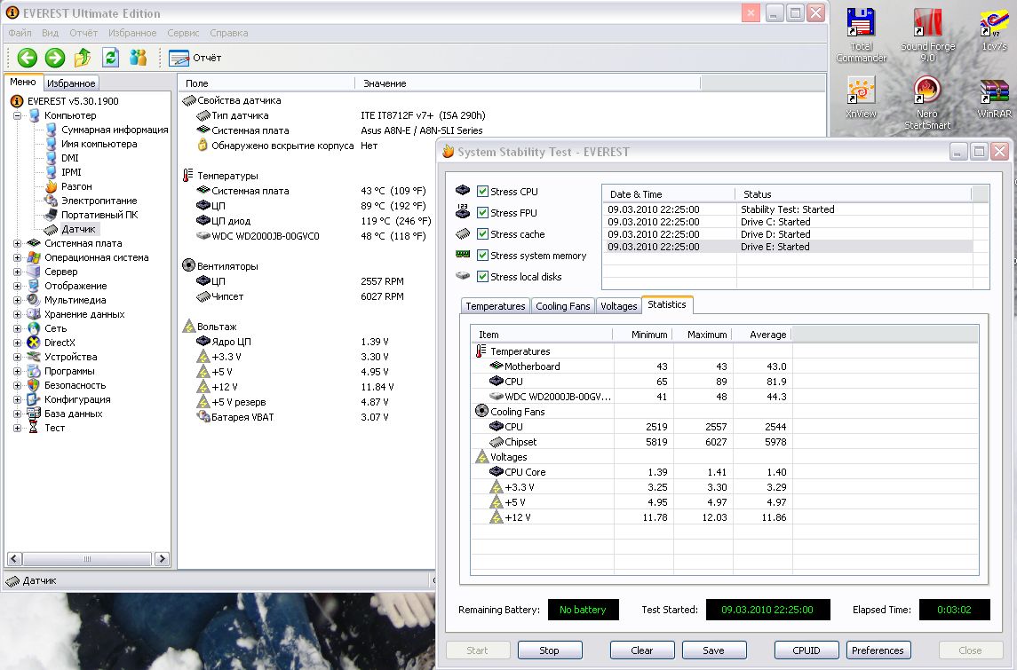 Также в программе Everest запустите тест стабильности системы на 7~10 минут и выложите здесь скрин вкладки Statistics