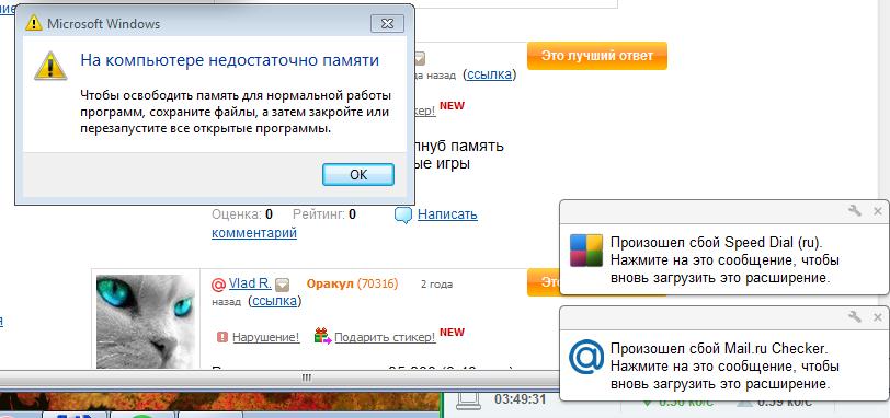 Я не знаю вирус или я что-то повредил в системе, но после некоторого времени (от часа до трех часов) появляется окошко " На компьютере недостаточно памяти!" первыми закрываются расширения в ХРОМЕ по-очереди, потом страницы закрываются с надписью "Опаньки!", потом закрывается ХРОМ, а потом начинают тупить другие программы и я перезагружаю комп. Так вот, когда появляется окошко ошибки, никаких других процессов нет, самые большие ресурсы съедает ХРОМ (это все по показаниям "Монитора ресурсов"). Далее, я на всякий случай увеличил в 2 раза объем виртуальной памяти(ну может для подкачки нехватает), и проверил виндовской утилитой "Средство проверки памяти Windows" - ошибок не выявлено. Проверял программой DrWeb Cureit! - проблема осталась, хотя он там какие-то вирусы удалил. Подскажите что-нибудь!