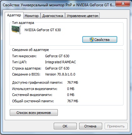Я недавно приобрел видеокарту Asus GeForce GT 630 4 GB и возникла такая проблема: система не использует не всю память видеокарты, вместо положенных 4 гб использует 767 мб. Заранее спасибо. |