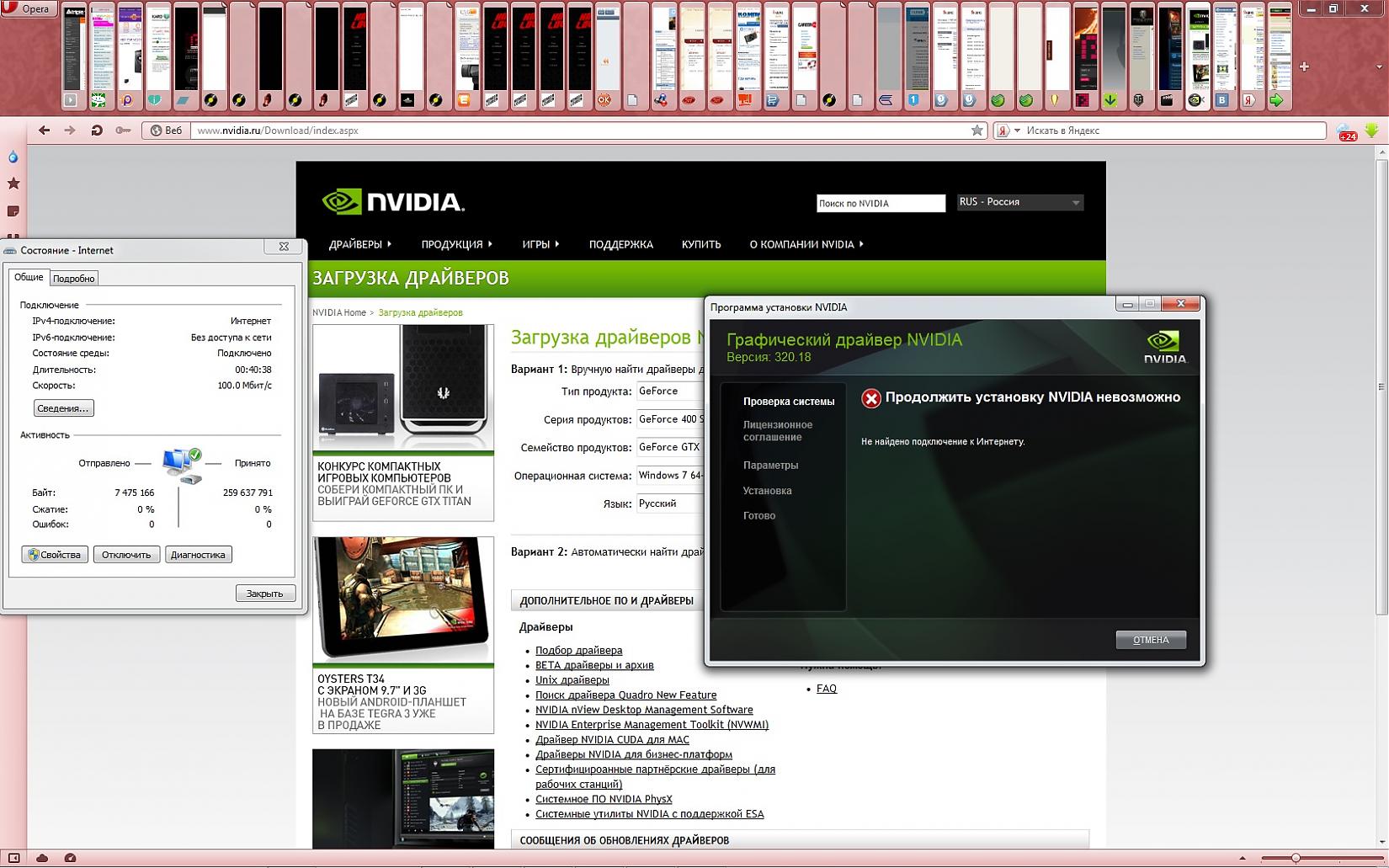 Не могу установить драйвер Nvidia на модель видиокарты Geforce GTX 460. Cтавлю драйвер 320.18-desktop-win8-win7-winvista-64bit-international-whql от 2013.05.23 для Windows 7 64-bit! При установке драйвера и проверки совместимости системы, выдаёт сообщение "Продолжить установку NVIDIA невозможно. Не найдено подключение к Интернету". При этом инет включен, пакеты уходят-приходят. Инет робит стабильно! Помогите пожалуйста! |