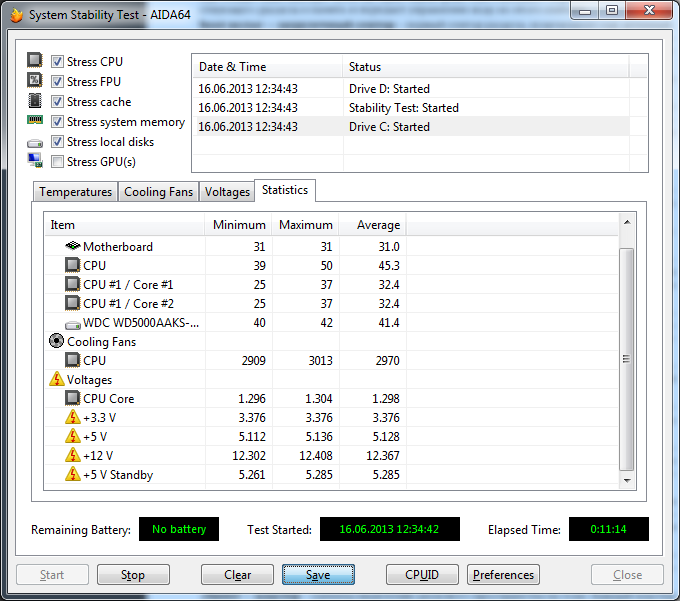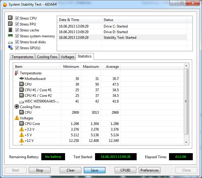 - подсоедините все HDD, всё доп.оборудование (в т.ч. USB-устройства, к фронтальным USB-портам не подсоединяйте!), которое используется при обычной работе ПК. В программе AIDA64/Everest проведите тест стабильности (Инструменты (UE) / Сервис (CE, BE, EE) -> Тест стабильности системы), ч/з ~10 мин снимите скриншот (кнопка Save) последней вкладки "Statistics" и прикрепите к сообщению. Показания напряжений и температур должны быть по всем возможным линиям. Выбирается в Preferens (Настройки - могут отличаться, зависит от модели МП и БП, в ноутбуках настроек меньше).