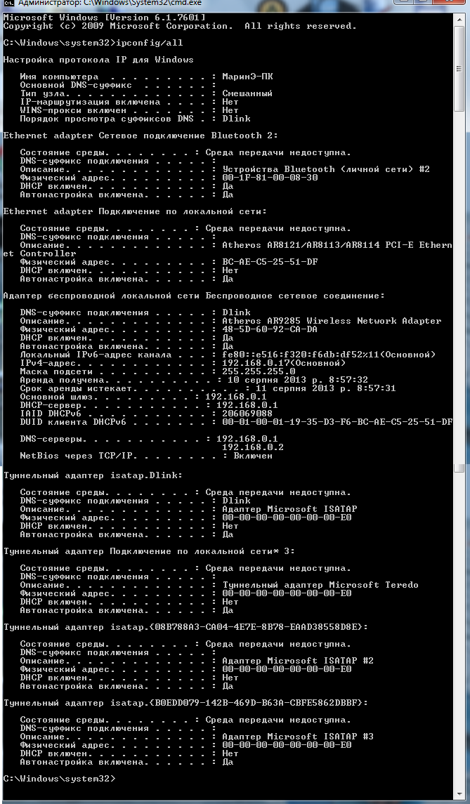 После того, как роутер перезагрузится, подключите заведомо исправным патчкордом проводную карту к порту LAN роутера и приведите ipconfig /all.