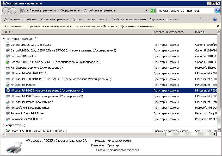 ну вот на сервере в Устройствах и принтерах смотрю HP LaserJet 400 M401 PCL 6 на Имя_комп (перенаправлено 2/скопировано 3) При этом Имя_комп - это сам сервер. Как я могу закрыть сеанс и что-то удалить при этом с сервера?? Или я что-то не догоняю? Есть просто HP LaserJet P2035n (перенаправлено 2/скопировано 1) Тут как понять кто есть кто? |