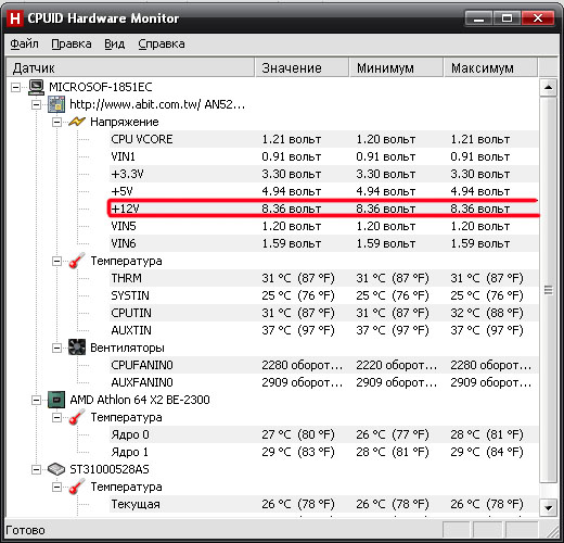 Комп как то вис всегда но редко и я особо не придавал этому значения. Но вот недавно начались просто ужасные вещи. Зависания сразу же при загрузках и вообще рандомно, когда ему захочется. Иногда можно было играть игру пол дня и ничего, а включив "калькулятор" - зависание. Причем виснет сразу намертво. Спасал только РЕСЕТ. Та и спасает. Перестал зависать так часто как раньше, после того как переставил перемычку на плате. Но всеравно. сейчас от 1 до 5 раз в день должен зависнуть. Сегодня правдараз, но еще не ночь. Грешил на все и перепробовал наверное тоже все. Даже отключал БП и запускал отдельно от платы. Тестер показал вюду отличные показатели, на всех контактах. Но вот что насторожило - это разные показания эвереста, спидфана и CPUID оп линии 12 В на БП. Эверест: http://forum.oszone.net/attachment.p...1&d=1395772308 Speedfan: http://forum.oszone.net/attachment.p...1&d=1395772308 CPUID: http://forum.oszone.net/attachment.p...1&d=1395772308 Но тестер говорит, что все гуд. БП 350 Вт. Правда ему около 5 лет. Но зависания начались пракитически сразу после покупки и сейчас только участились. Тест винта и оперы ничего не показал. Опера тестировалась с флешки из под биоса. Винт выдал только пару красных секторов и ни одного бэда. Конфигурация: Система - ХР Материнка - Abit AN52N Проц - Athlon X2 DealCore BE 2300 1,9Ггц ОЗУ - 2 Ггб Винчестер - Seagate Barracuda 1Tb Видео - ATI Radeon X1650 http://forum.oszone.net/attachment.p...1&d=1395772880 |