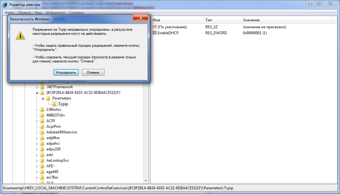 На разделе HKLM\SYSTEM\CurrentControlSet\Services\{8c9f291a-6824-4103-ac32-8dba4ce5321f}\Parameters\Tcpip выдаёт такую ошибку при проверке разрешений. Нажимать упорядочить? |