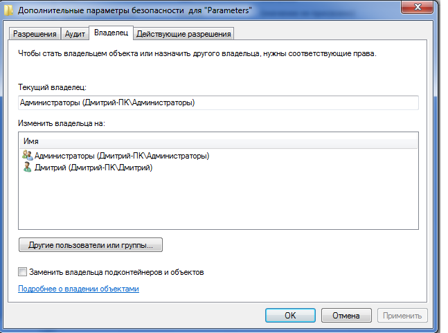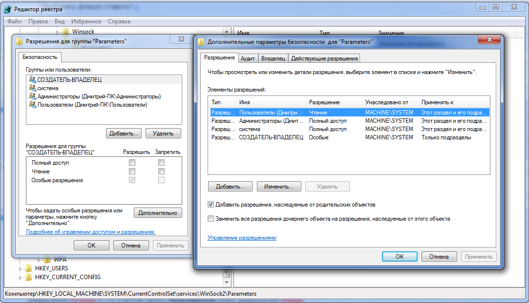 Убедитесь, что учетные записи система и Администраторы имеют разрешение Полный доступ,что учётная запись СОЗДАТЕЛЬ-ВЛАДЕЛЕЦ имеет разрешение Особые и что учётная запись Пользователи имеет разрешение Чтение. Ещё убедитесь что владелец ветки HKEY_LOCAL_MACHINE\SYSTEM\CurrentControlSet\services\WinSock2\Parameters является учётная запись Администраторы и пришлите экспорт этой ветки реестра. Убедитесь что у вас всё как на скриншотах ruslan... Когда убедитесь что у вас всё как надо проведите проверку ЖД |