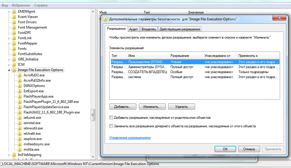 Я так понимаю, что здоровые системы рядом есть. Сверьте разделы реестра, их подразделы и разрешения на разделы и их подразделы: HKEY_LOCAL_MACHINE\SYSTEM\CurrentControlSet\services\igfx HKEY_LOCAL_MACHINE\SOFTWARE\Microsoft\Windows NT\CurrentVersion\Image File Execution Options Если возможности сверки нет, сделайте скриншоты разделов, их подразделов и разрешения. Вложите в архив и подкрепите к сообщению. |
