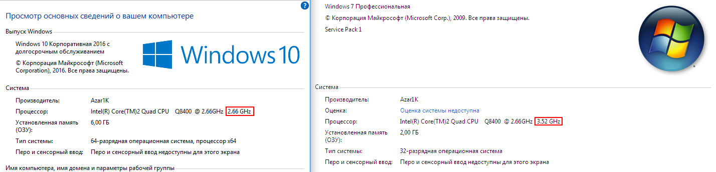Почему у меня частота в свойствах системы показывается та, которая указана в официальном значении маркировки процессора. У меня реально Intel C2Q Q8400 2.66 GHz работает на 3.5GHz Прикрепил файл. Слева живая система, справа – на виртуалке. Дело в том, что вин 7-8-10 что на виртуалбоксе, что на ВМваре одинаково показывают реальную частоту, а без виртуалки, на реальной машине, указывается левое значение! |