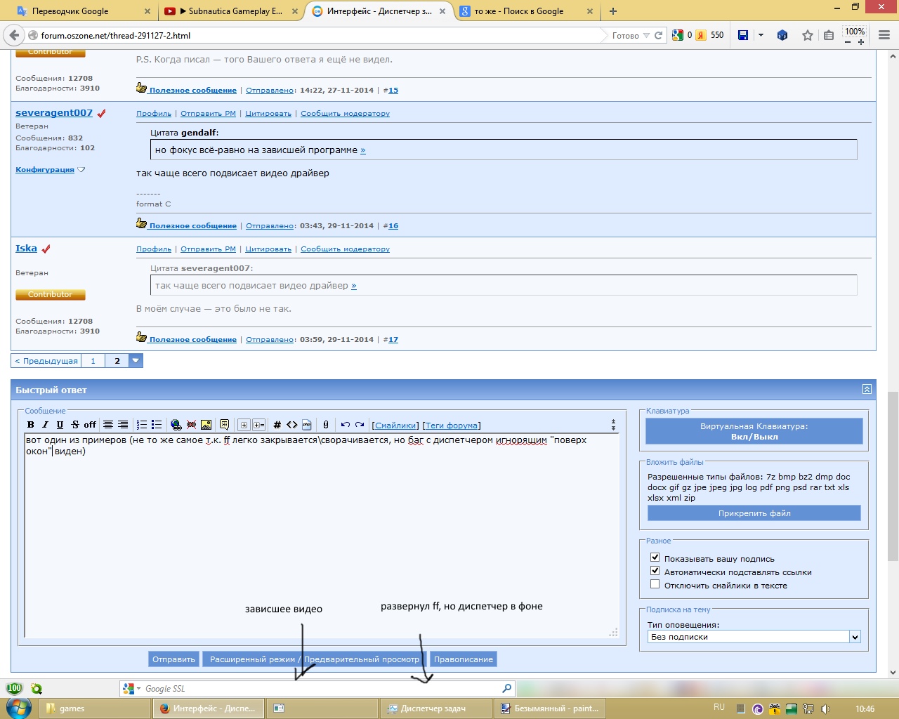 Профиль | Отправить PM | Цитировать вот один из примеров, не тоже самое что я раньше писал, т.к. ff легко закрывается\сворачивается и комп в целом не завис, но баг с диспетчером, игнорирующим "поверх всех окон" виден. Причем вообще ничего поверх ff открыть не могу (всё, включая "пуск", открывается в фоне, если ff в фокусе).