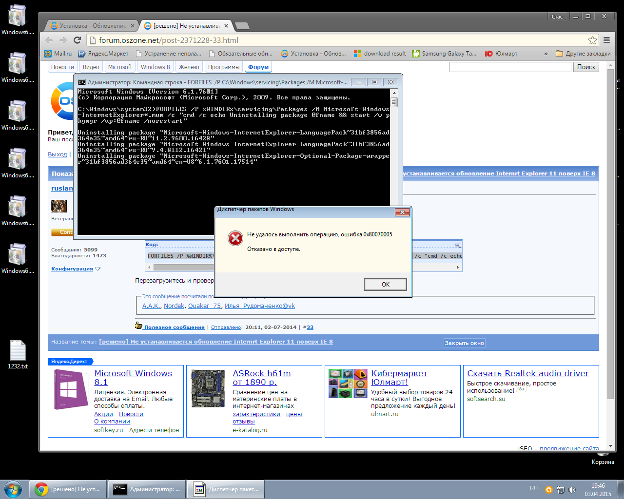 спасибо за подсказку, сам бы никогда не догадался, сидел бы и переписывал вручную после запуска команды несколько раз появлялось окно с ошибкой 0х80070005 и "Отказано в допуске" (скриншот прилагается) после окончания выполнения команды сделал перезапуск, проблема осталась (Windows6.1-KB2533623-x64 не ставится) точка восстановления видимо не удалась.... |