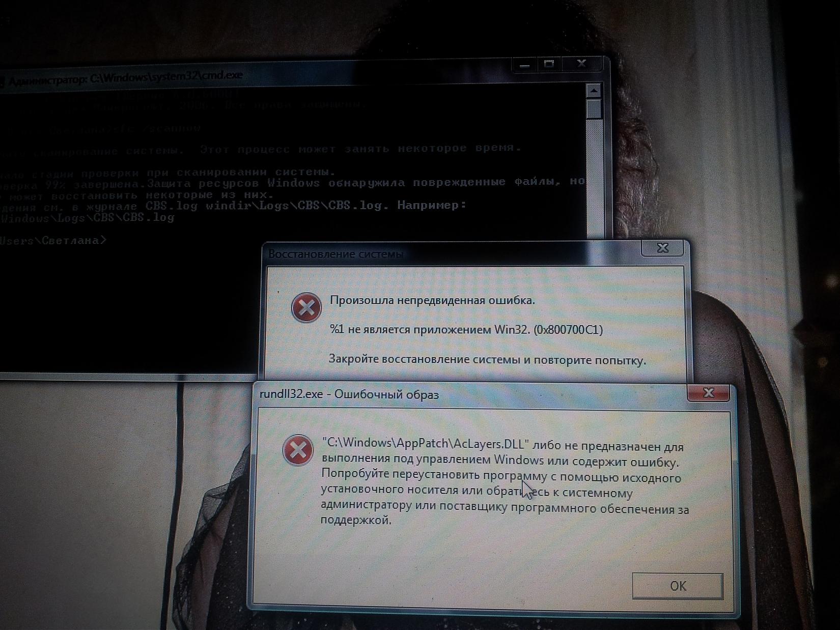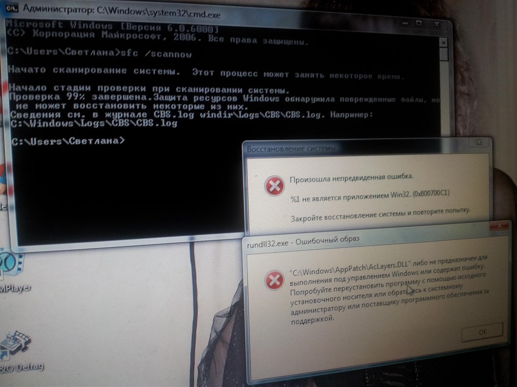 пожалуйста помогите не хочу делать переустановку винды хочу восстановить, ноут не мой а мамин, ее все устраивает только бы восстановить поврежденные файлы, работает только музыка и по мелочи + командная строка. при запуска через пуск восстановление системы выдает ошибку типо нет dll или exe ошибочный образ. выложил скриншоты ошибок может еще какие то есть через ком строку пишет что повреждены файлы. не могу даже нажать на диск С и нажать свойство тупо нечего не происходит. Спасибо всем!!!