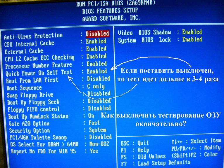 Помогите решить проблему с БИОСом. При загрузке компьютер слишком долго тестировал память. Это сильно раздражало. Изменил параметр как показано на фото во включено. Теперь при загрузке стал тестировать раза в три короче по времени. Но вот как выключить это тестирование окончательно? Спасибо за любые советы. |