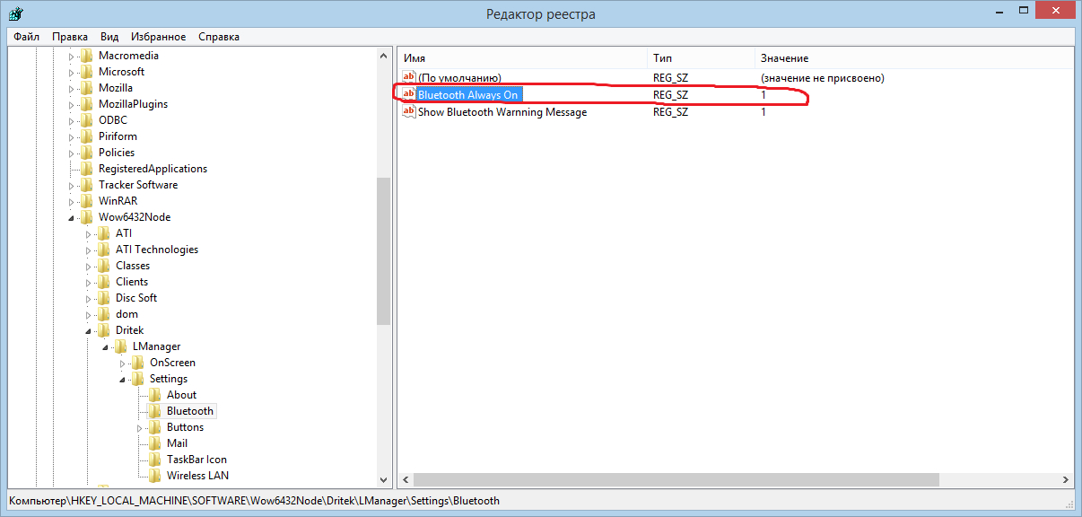 В реестре установил значение "1" для запуска Bluetooth при старте Windows. HKEY_LOCAL_MACHINE\SOFTWARE\Wow6432Node\Dritek\LManager\Settings\Bluetooth Bluetooth Always On = 1 http://forum.oszone.net/attachment.p...1&d=1422536763 Проблему не решило. При включении ноутбука Bluetooth выключен. I Need Help ![]() |