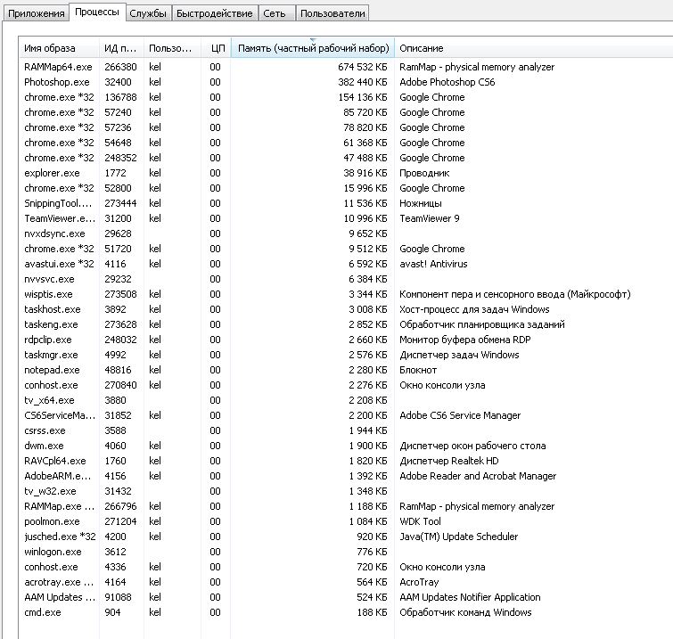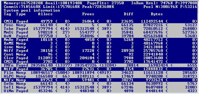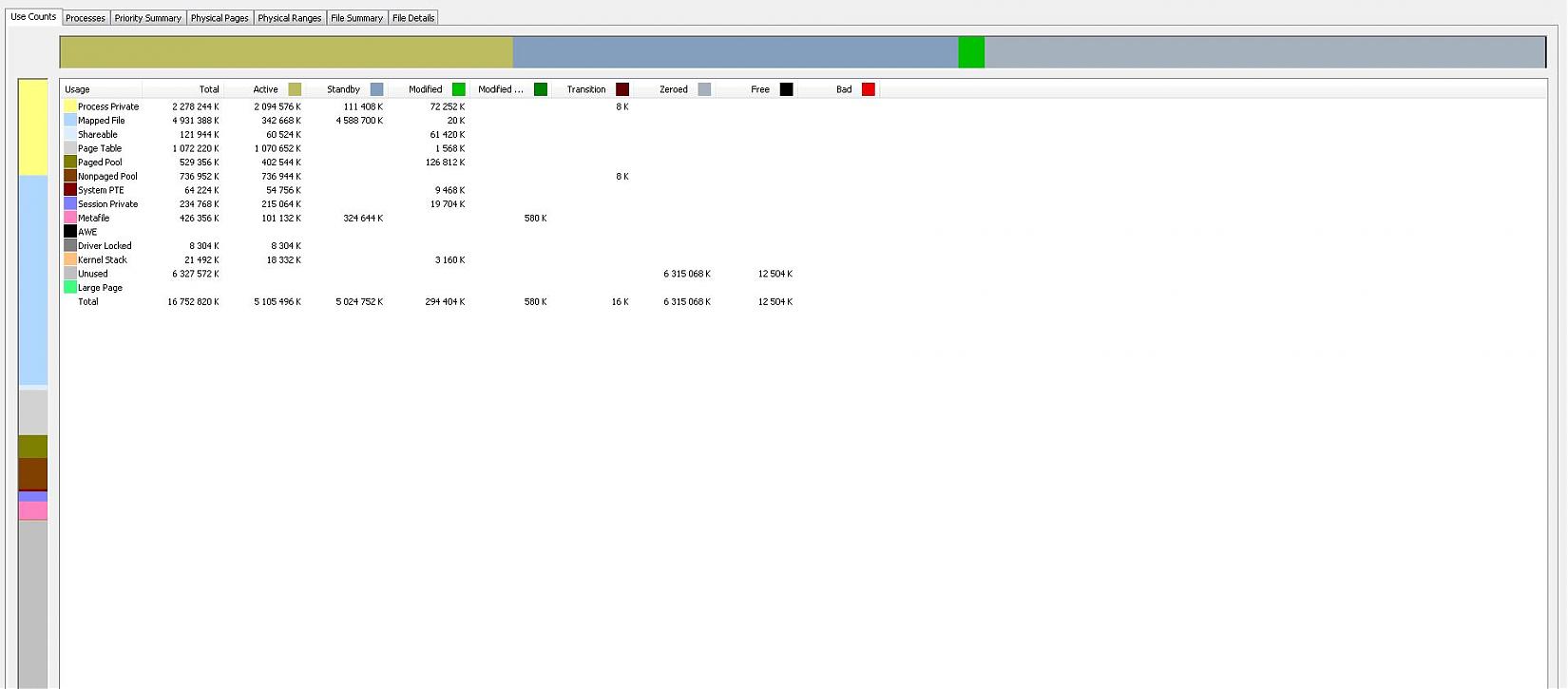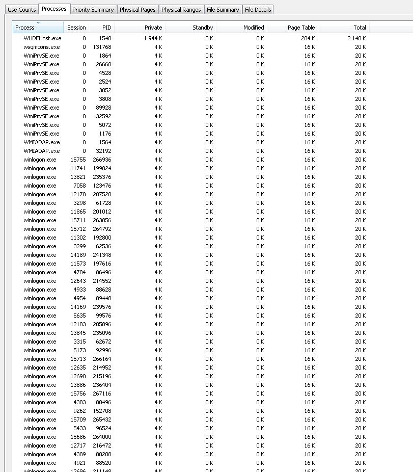 Исходные данные: Windows 7 Pro x64, 16 Gb RAM, PC, который работает постоянно и делает перезагрузку лишь для обновлений windows, из программ и дров ничего криминального и специального, антивирус avast (лишь бы был) Суть проблемы: после примерно недельной работы кончается оперативная память и PC просто висит пока не пнешь его в перезагрузку (причем только кнопкой) Что делал: 1. Подозрения на утечку в драйвере или проге возникли сразу, но для чистоты моей совести сканировал на вирусы: Cureit, Kaspersky LiveCD, avz, malwarebytes, combofix, adwCleaner (последние три для души). Были некоторые недочеты, но к проблеме они отношения не имели. 2. Копаем в сторону - "Где оператива?". Запускаем Rammap (рисунок 1). Ничего не понятно... Ясно только одно - со временем растет mapped file и забивает всю память. 3. Запускаем poolmon (рисунок 2). Вот такая картина маслом. Начал копать в сторону дров и утечки. Удалил всякие alladin, rapid storage, короче оставил только основные. CM31 вообще не могу обнаружить через strings. 4. Отчаился. Переставить windows и забыть? Нет, не интересно. Решил удвоить усилия. 5. И тута я развернул еще раз rammap и увидел следующее (рисунок 3). И так все процессы системные (smss, winlogon, searchwindows и т.д.). Их по тысячи и более каждого. PID-ы доходят до миллиона. Сразу в догонку процессы в Диспетчере задач (рисунок 4). А тут вроде все отлично. Process Explorer тоже ничего такого не видит. Не знаю что и думать... 6. Запускал Rammap на других компах, там все процессы по одному. Собственно вопрос: Куда копать? |