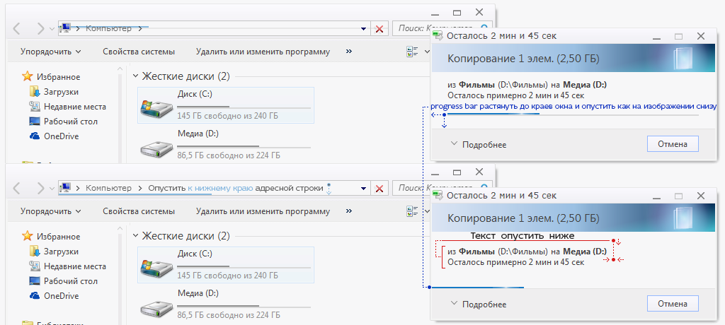 При создании темы оформления для Windows 7, возникла одна задача - изменение позиции Progress Bar'а. (далее "прогресс бар"). Прогресс бар измнен был на более узкий и поэтому в проводнике стал смотреться как-то не корректно. Предполагаю, что позицию возможно изменить, отредактировав файл shellstyle.dll из папки с темой (C:\Windows\Resources\Themes\Theme\Shell\NormalColor). Прилагаю изображение, на верхней половине - как есть и на нижней половине - как должно быть. Надеюсь, кто-нибудь знает решение. Спасибо за внимание. |