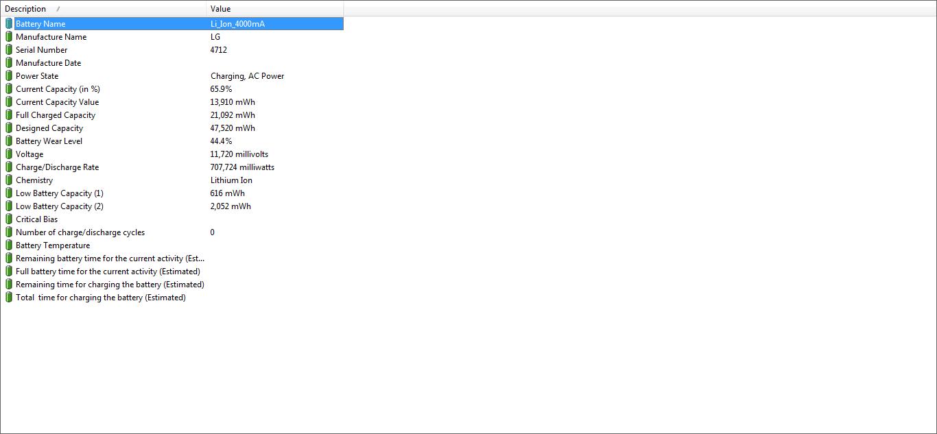 Оставил ноут на пару дней дома, как приехал, то обнаружил, что он от батареи не работает, только с зарядкой. Писало, что доступно 44% заряда, вынимание зарядки дает моментальное выключение ноута. Вроде бы даже заряжается, но ооооочень медленно, за 3 дня стало 65% :D Проверил состояние батареи утилитой BatteryInfo, скрины прилагаю. У друга такой же ноут, ставил рабочую батарею - все ок, моя батарея в его ноуте тоже дохлая. Можно ли что-то сделать, или надо менять? (какие же батареи дорогие ): Кстати: до этого тоже был мини-трабл: обычно при низком заряде ноут выдает предупреждение, у меня его перестало выдавать и ноут вырубался при маленьком заряде. Про то, сколько держала батарея раньше: в эконом режиме часов 5-6, в обычном 2-2,5ч. Спасибо за помощь. P.S.Сорри, если сабж уже обсуждался где-то |