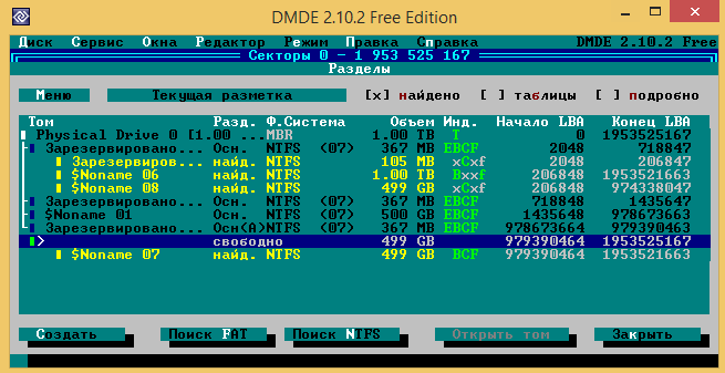 По снимку: встаньте на последнюю строку, $Noname 07, и нажмите ставшую активной кнопку "Открыть том". И посмотрите структуру. Думаю что всё нормально там. У вас исходная разбивка 500+500 гигабайт? И я забыл попросить брать не консольную, а GUI-версию утилиты (голубая табличка "Скачать DMDE для Windows"; остальные относятся к "Скачать другие версии)": я как-то привык к ней и многое там оцениваю чисто зрительно – а в консольную версию надо вникать дополнительно. Тем более что видно, что диск не первый раз подвергается изменению разделов (возможно при переустановке системы): три актуальных раздела "Зарезервировано системой", а активным является третий из них, расположенный после диска С: прямо перед [тем, который хотим восстановить] диском D:. И на всякий случай хотелось бы увидеть картину в более привычном мне виде. PS Хммм... У вас уже существуют 4 основных раздела – а удалённый, судя по скриншоту, тоже был основным, в то время как при стандартных операциях с MBR-диском можно создать не более 4 разделов в сумме (основные + дополнительные). Поэтому тем более хотелось бы увидеть картинку GUI-версии с двумя (одно частично наползает на другое) окнами при открытии диска как физического устройства. |