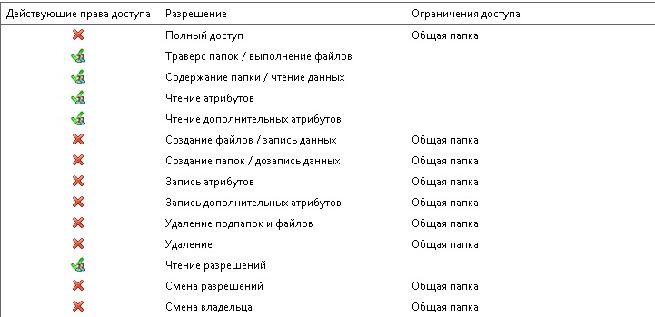 ПС: Кстати, для интереса посмотрел действующие разрешения группы, для которой я на эту папку выставил полный доступ как и для пользователя Иванова, но если у иванова есть несколько зеленых галок, то для группы все красные. |