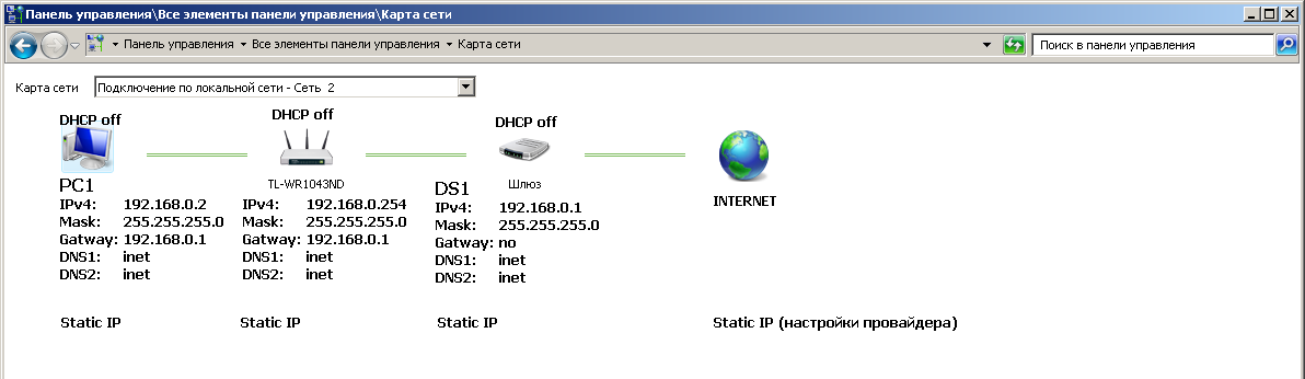 Помогите, пожалуйста, решить проблему с подключением. Сама не сильно подкована в этих делах. Исходные данные: Есть комп на OS Win 2008 R2 SP1 Enterprise с именем DS1. На нем задействовано два сетевых интерфейса: Одна сетка смотрит в интернет, подключение типа Ethernet без всяких VPNнов и дозвонов. Адрес белый, настройки подключения прописаны статические ручками, IPv6: отключен, DHCP: отключен. Сетка №2 смотрит в локальную сеть, адрес тоже прописан ручками, IPv6: отключен, DHCP: отключен. IPv4: 192.168.0.1, mask: 255.255.255.0, def. gateway: нет, DNS1: от интернет-провайдера, DNS2: от интернет-провайдера. К данному серверу подключен домашний комп PC2 (OS Windows 7 x64 SP1 Ultimate) по расшаренной для него локальной сети через "свитч". Адрес "свитча" задан руками по LAN: 192.168.0.254, mask: 255.255.255.0, def. gateway: 192.168.0.1, днски прописаны от провайдера. На домашний комп PC2 расшарен интернет с сервера DS1 по локальному сетевому подключению. Настройки сети на PC2 прописаны так же руками. IPv4: 192.168.0.2, mask: 255.255.255.0, def. gateway: 192.168.0.1, DNS1: от интернет-провайдера, DNS2: от интернет-провайдера. IPv6: отключен. Как дополнительным (наверное, не существенным) условием сообщу, что с PC2 по второму сетевому интерфейсу раздается WiFi для подключения мобильных гаджетов. Сеть локальная пингуется, интернет на PC2 работает и не отваливается. Но как только с PC2 на DS1 пытаюсь подключиться по лану r RDP или как-то еще, то подключение к DS1 извне пропадает, хотя извне RDP тоже работает и подключается, а интернет на PC2 тоже продолжает работать. Суть вопроса: Как устранить недоступность DS1 по интернету извне при одновременном подключении по локальной сети PC2? Что не так в настройках сети? |