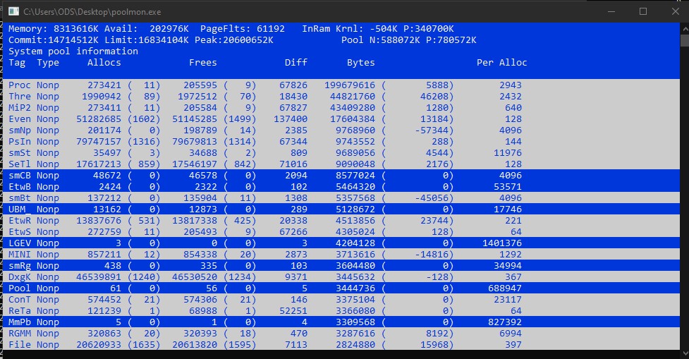1. Запустите RAMMap и покажите скриншот вкладки Use Counts во время глюка. 2. Если утечка в Nonpaged Pool или Paged Pool - причина в каком-то из драйверов. Чтобы его определить: