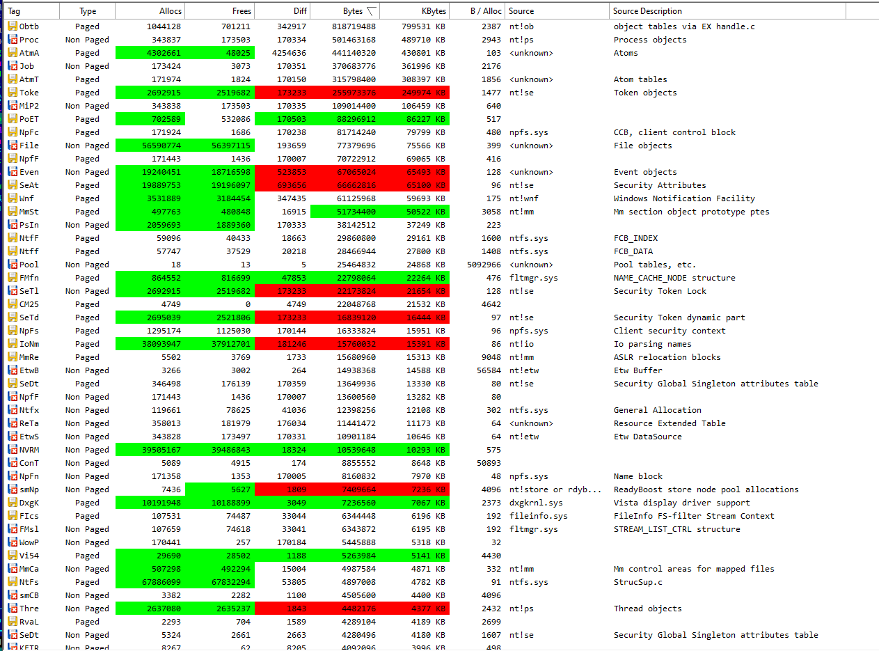1. Запустите RAMMap и покажите скриншот вкладки Use Counts во время глюка. 2. Если утечка в Nonpaged Pool или Paged Pool - причина в каком-то из драйверов. Чтобы его определить: