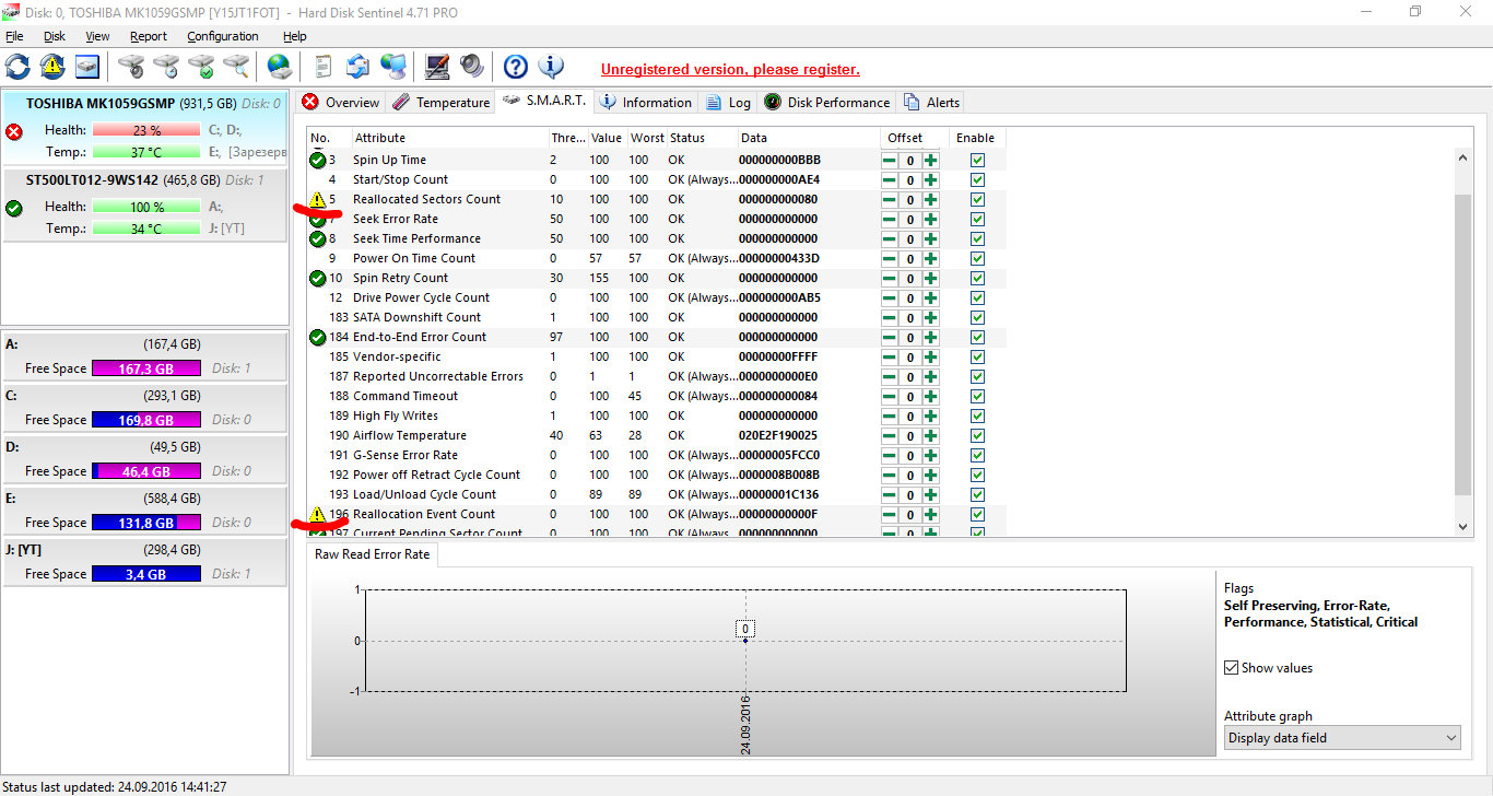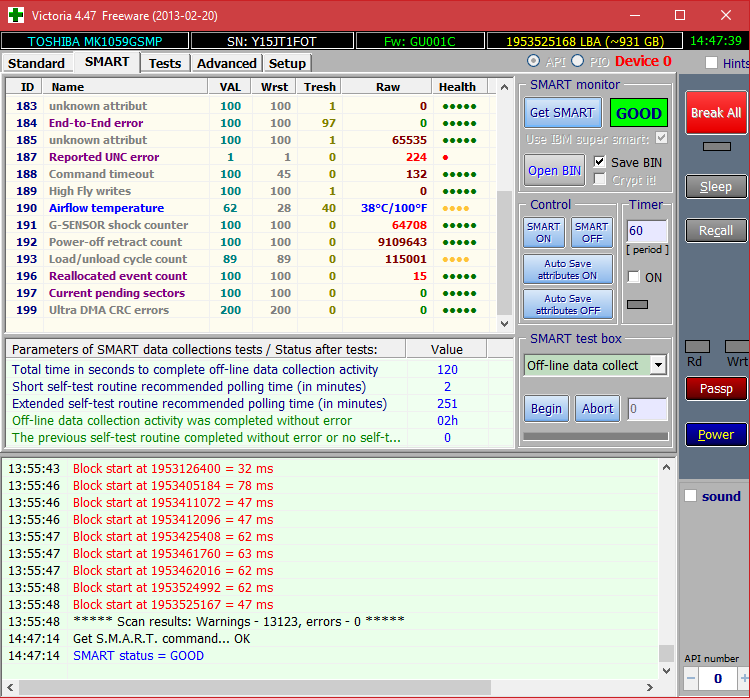 TOSHIBA MK1059GSMP Программа HDD Sentiel обнаружила в HDD ошибки и сказала что жить ему ~50 дней... http://forum.oszone.net/attachment.p...1&d=1474718160 Сам в шоке 0_0. Думаю как 50 дней? Вот скриншот HDD Sentiel (S.M.A.R.T) http://forum.oszone.net/attachment.p...1&d=1474718160 И запустил я всеми известную Викторию. Поставил сразу режим Remap http://forum.oszone.net/attachment.p...1&d=1474718160 Однако есть одно НО! Виктория говорит нам что со S.M.A.R.T все в порядке! (Хотя есть пункт там плохой..) http://forum.oszone.net/attachment.p...1&d=1474718160 Решил для уверенности посмотреть CrystalDiskInfo: http://forum.oszone.net/attachment.p...1&d=1474718160 Статус:GOOD! Вот теперь сижу и думаю что делать... Так же скидываю отдельно от вложении BIN файлы от виктории + Лог виктории http://filebaza.url.ph/repository/HDD.zip Сам в СМАРТАХ не шарю, прошу помощи форумчан. ----------------------------------------------------------- Модераторам: Я тут совсем зеленый(Новенький), так что если оформил не правильно, прошу понять и простить, ну а так же указать на мои ошибки. |