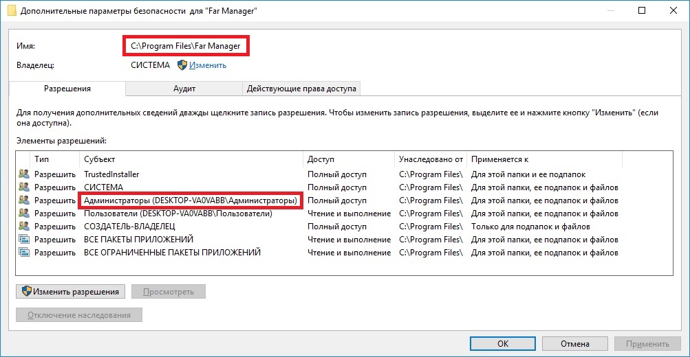Помогите разобраться пожалуйста. Установил Windows 10 pro. При установке создался пользователь с группой "Администраторы". Установил "Far Manager 3 x64" с указанием хранения всех настроек в папке самой программы "C:\Program Files\Far Manager", т.е. по сути сделав Portable. Все прекрасно работает, если запустить от имени администратора. А вот с командой "Открыть" нет доступа. Но почему, ведь пользователь из группы Администраторы? В разрешениях все есть. http://forum.oszone.net/attachment.p...1&d=1489934449 З.Ы. Far Manager - это как пример. Есть еще куча программ, которые хранят настройки и временные файлы в своей же папке. |