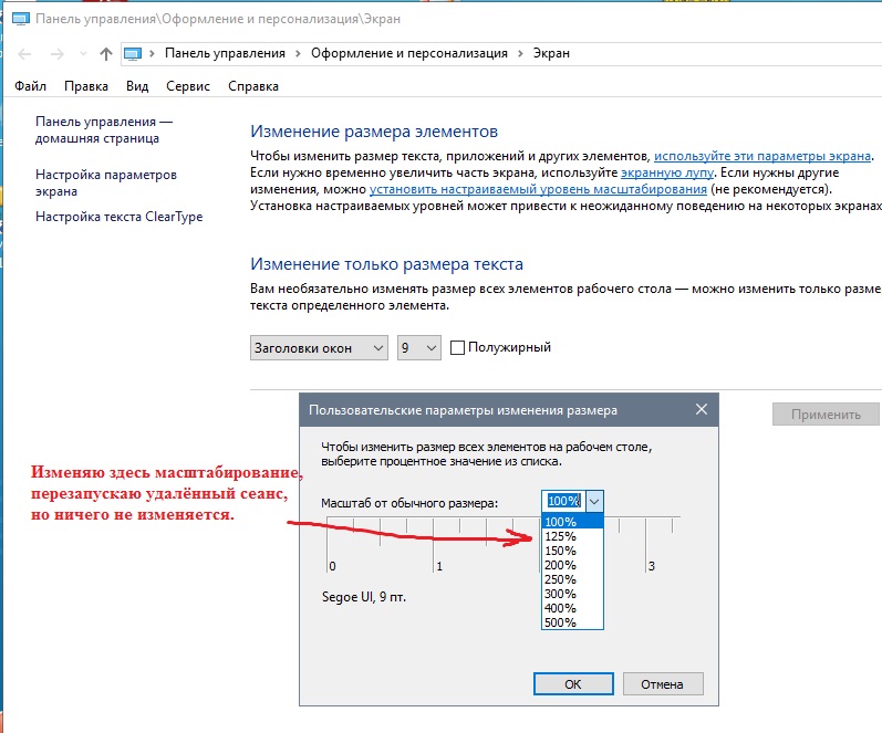 Дополнительные изменения размера текста и других элементов->Установить настраиваемый уровень масштабирования Здесь масштабирование изменить можно,