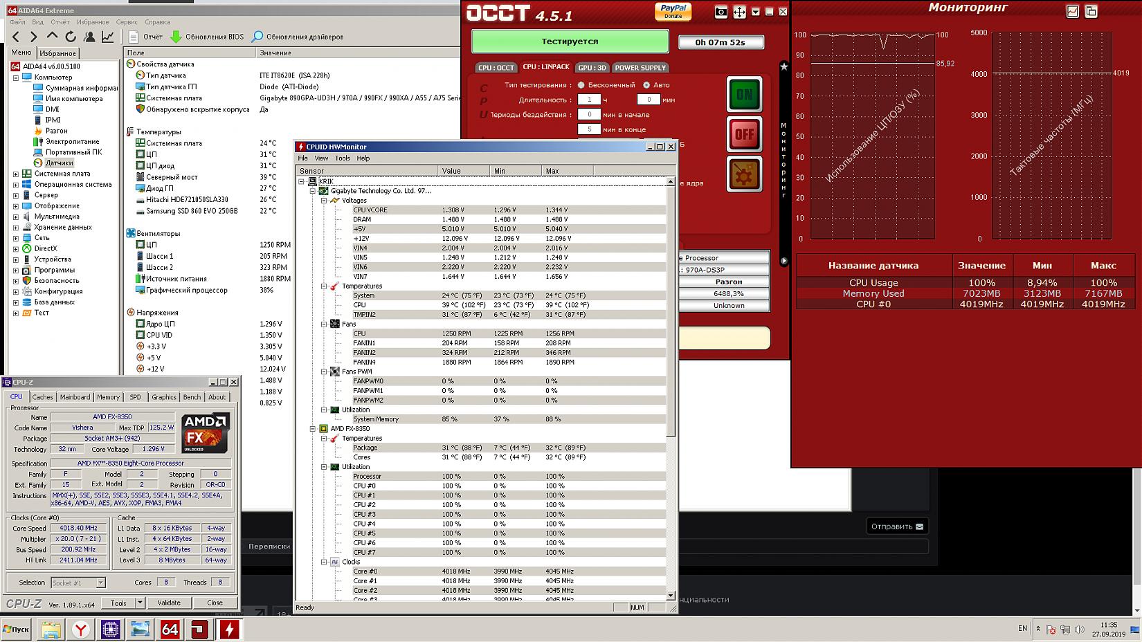 1) Мать: Gigabyte GA-970A-DS3P rev 2.0 2) ГПУ: ASUS HD Radeon 7770 1gb 3) ОЗУ: Kingston HyperX Fury Black 2x4gb 1600MHz 4) ХДД: Seagate 500 гб 7200 об/м 5) ССД: Samsung 860 EVO Sata типа 6) БП: Cougar VTE600 (540w по 12в линии), новый, только купленный 7) ЦП: (Виновник торжества) FX-8350, тоже новый, только купленный 8) Кейс: Zalman Z11 7 вертушек (5x120мм, 2х80мм), на радиаторе ВРМ приколхожена вертушка 40мм. 9) Башня на ЦП: Zalman CNPS10x Optima Собственно сами проблемы: 1: Свапнул БП и Проц, до этого были Detech 500w (370w по 12в) и Phenom II x4 955 (95w tdp версия) на Cougar VTE 600 (540w по 12в) и FX 8350. При свапе проверил работоспособность камня еще на старом бп, завелся, все нормально, зашел в биос. В биосе он прямо моментально разогрелся до 77 градусов, естественно манипуляции я никакие не проводил - тут же выключил пк с кнопки. Далее, собрал полностью системник (без учета боковых крышек), запустил - при запуске ПК он: 1) Включается на секунду 2) Выключается полностью (глохнут кулеры, выключается подсветка и т.д.) 3) Через 3-5~ секунд заново включается и нормально грузится без всяких ошибок и т.д. в винду При нормальной перезагрузки из под винды ведет себя точно так же, т.е. : перегрузился>выключился на 3-5 сек>запустился. Стоит ли бить тревогу или ничего страшного в этом нет? 2: После смены проца появились какие-то фантастические температуры в софте для мониторинга: 1) Процессор в простое 4-10 градусов, НБ в простое 22 градуса. 2) Процессор под нагрузкой ОССТ+Линпак (без АVX) 31 градус (пик 32), НБ под нагрузкой 38 градусов (39 пик). 3) Напряжение на ЦП скачет, в простое 1.344в, под нагрузкой 1.296в (самое низкое) БП по линиям не садит. Естественно такие температуры и скачки напруги насторожили, по этому полез мерять "пальцевым" методом под нагрузкой (все тот же ОССТ+Линпак без AVX). 1) Теплотрубки башни у основания на ощупь холодные 2) Текстолит на МП сзади, в районе процессора, теплый, но палец можно держать хоть с утра до утра 3) Текстолит на МП сзади, в районе НБ теплый, но опять же палец не обжигает. Сам радиатор НБ тоже палец не обжигает, выше температуры тела немного (думается где-то в районе этих самых 40~ градусов) 4) Текстолит на мп сзади, в районе ВРМ, был горячим по всей площади (от защелок радиатора до ножек распайки ВРМ). Палец долго держать можно только через силу. Приколхозил одну 40мм вертушку (есть еще одна если что) на радиатор ВРМ - запустил стрестест еще раз, палец уже удержать в зоне ВРМ можно было вполне. Еще горячий (горячее НБ, к примеру) но уже так сильно не обжигало 5+ секунд держать можно без напряга. Но скачки напруги не пропали. Частоты во время теста держит, не сбрасывает. Биос МП не шил. Энергосберегайки в биосе выключены все, турбокор тоже отключен, частота залочена на 4ГГц (сток), все остальное на авто (напруги/память). Почему начал бить тревогу: Прошлый камень (Phenom 955 95w tdp) грелся и сам больше (40-45 в нагрузке) и НБ грел сильнее (50-55) в нагрузке. |