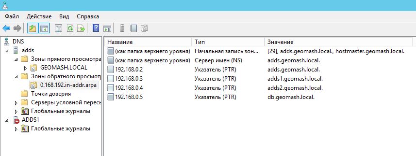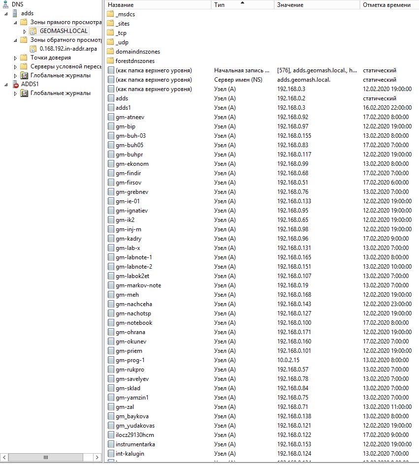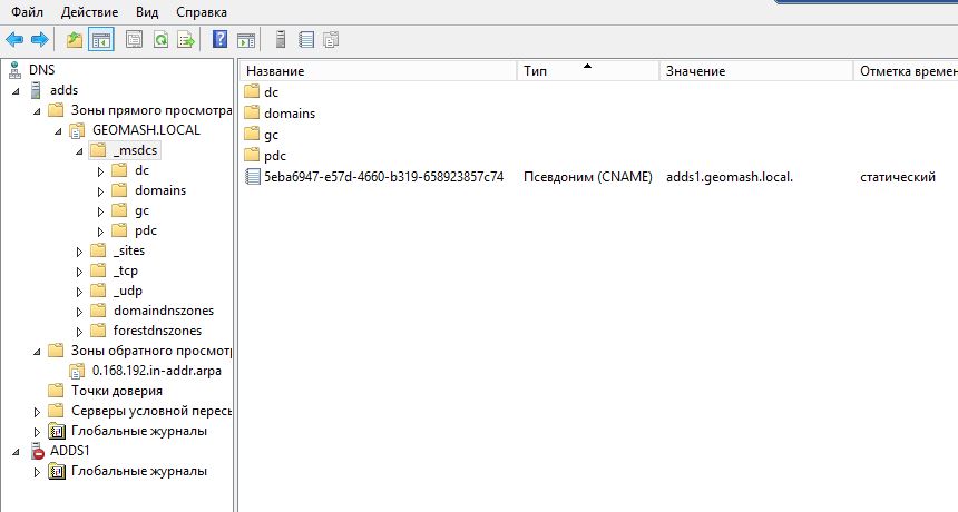 5eba6947-e57d-4660-b319-658923857c74 псевдоним 5eba6947-e57d-4660-b319-658923857c74._msdcs.GEOMASH.LOCAL FQDN adds1.geomash.local. полное доменное имя (FQDN) конечного узла И ещё вопрос, обязательно ли создавать статичные записи A узла для серверов ADDS, ADDS1, ADDS2 и DB? |