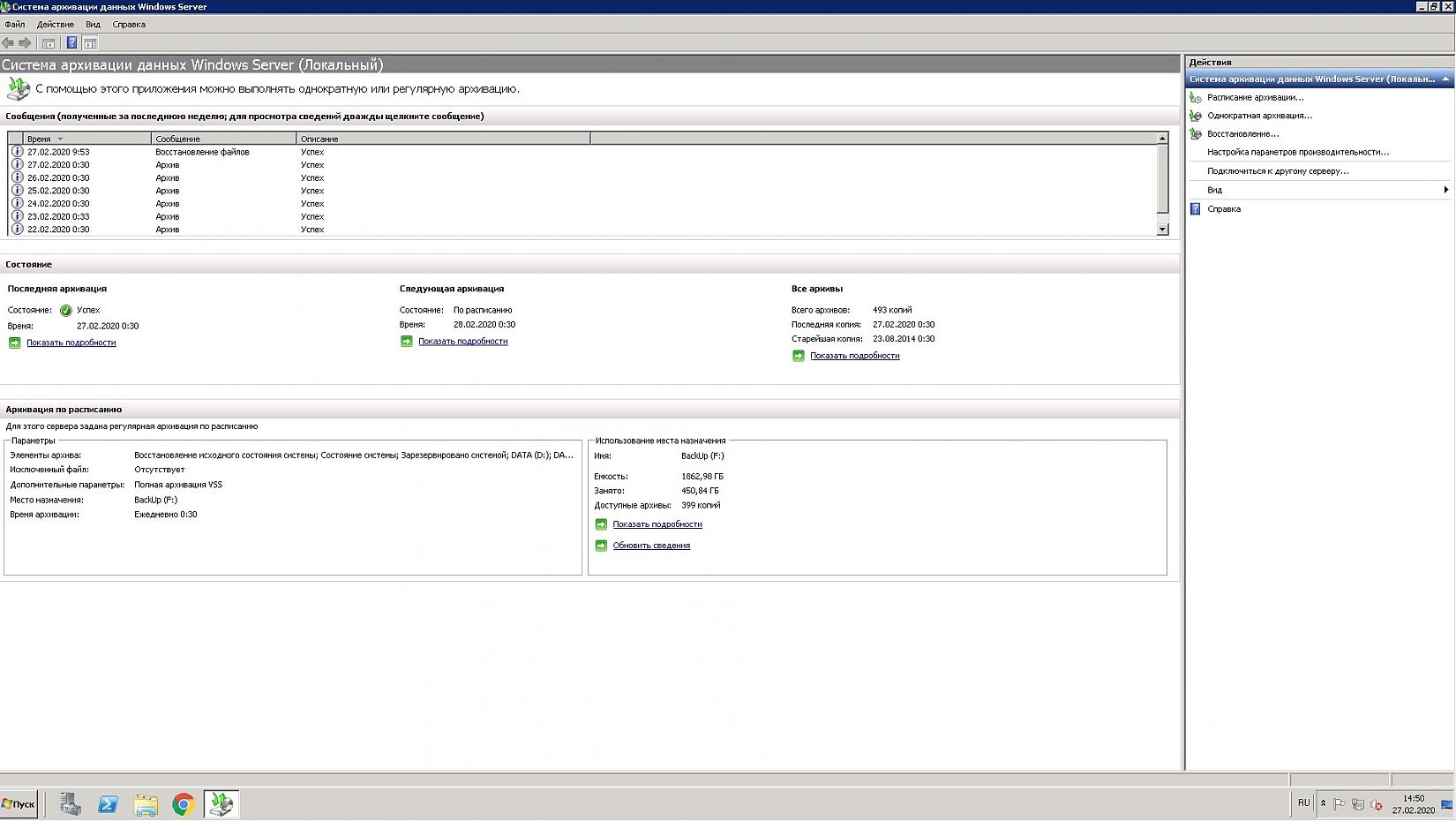 На сервере Windows server 2008 R2 Standart настроена архивация данных, по логам копии успешно выполнялись каждый день и в меню показывает что есть 480 копий (скриншот прикреплен), на жестком диске куда выполняется бэкап места тоже достаточно - занято 450гб из 2Тб. Но при попытке восстановить файлы выдает что доступно только 2 копии - за сегодня и вчера. Как такое могло произойти и как вернуть остальные старые копии?