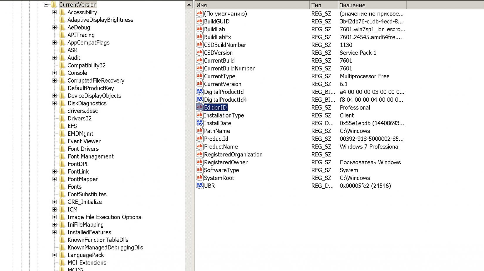 Изначально была Enterprise. Надо сделать Professional или Ultimate. В реестре значение поменяно, ключ удален, но она все равно продолжает считать себя корпоративной. Ключ от Professional ни в какую ставиться не хочет. Ключ от Enterprise ставится без проблем В чем тут хитрость?