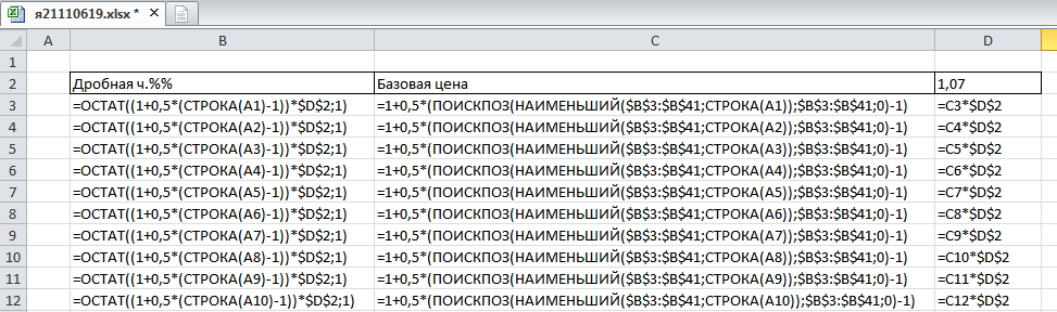 В столбце B (в примере в диапазоне $B$3:$B$41) занесены последовательно дробные части, как Вы это обозвали, базовой цены. Базовая цена вычисляется как B=1+0.5*(i-1) где i=1,2, ... и от этого берётся дробная часть как остаток от деления B/1 В столбце C в ячейках столбца B последовательно ищутся наименьшие 1, 2 , 3 значения и их позиция в этом массиве чисел. По найденной позиции вычисляется значение базовой цены. По базовой цена в столбце D умножается на 1,07. То есть что Вы требовали, если я правильно понял, Вы получили. Базовые цены, умноженные на проценты, рассортированы по возрастанию дробной части. Еще раз: в столбце B дробные части базовой цены, умноженной на проценты, расположены по возрастанию базовой цены. В столбце С базовая цена уже расположена по возрастанию дробной части сумм, умноженных на проценты, Очевидно, дробная часть в суммах в столбце D идёт по возрастанию, что мы так упорно добивались . Столбец B - служебный. Не нравится - скройте его. Не уверен, что смогу решить задачку без служебного столбца. Смысла как-то в ней не сильно вижу, хотелось бы понять, зачем это нужно. Макрос - и флаг в руки, если это не разовая акция. |