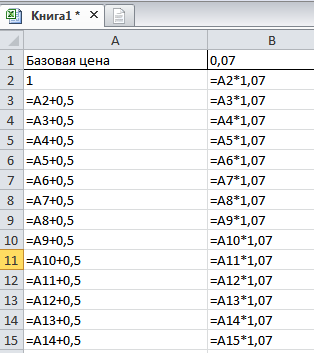Excel как-то странно себя ведет. Первую колонку с шагом в 0,5 он посчитал нормально. Я ввел сначала 1,0, потом 1,5, далее потянул выбранный столбик вниз и он сам уже добавил все последующие цифры (2,0 и т.д.). Для второй колонки нужно прибавить +7%. Я вручную вбил формулы и он прибавил проценты. После третьей ячейки я подумал, что он поймет чего я от него хочу и аналогичным образом потянул столбик вниз, но вместо того, чтобы рассчитывать проценты из первого столбца, он просто начал дублировать первые три значения, которые я вбивал вручную: