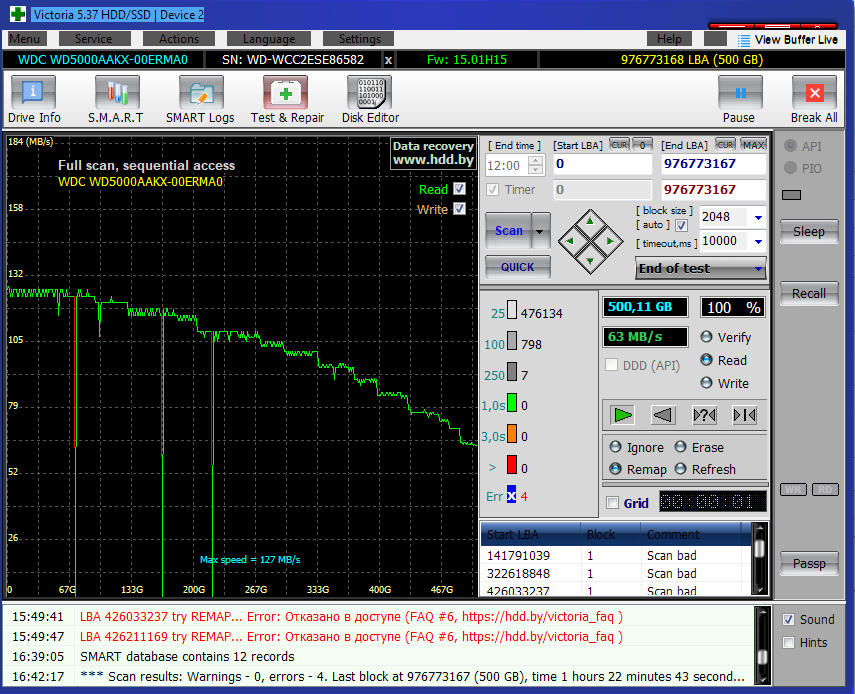 Помогите пожалуйста устранить, проблему: http://forum.oszone.net/attachment.p...1&d=1657954436 На этом диске у меня только игры, но с недавнего времени игра стало невозможно, игры виснут каждые 20-30 секунд на 3-5 секунд, играть невозможно. Виктория не видит неисправимые ошибки секторов при тесте на чтения, как их определить и убрать (восстановить/затереть) ? на воспроизведение игр это не повлияет ? До этого были штук 15 нестабильных секторов, но потом куда то пропали и остались только 25 неисправимых ошибок секторов, при тесте на чтения повторюсь виктория не видит не одного бада, все чисто и хорошо, но смарт плоховат. http://forum.oszone.net/attachment.p...1&d=1657955342 |
