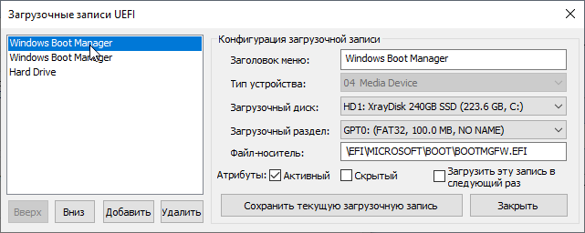 Профиль | Отправить PM | Цитировать Утилиту BootIce скачайте и зайдите в ней на вкладку UEFI > Edit boot entries. Там, соответственно, проверьте, чтобы для .efi-приложения "Windows Boot Manager", расположенного на новом SSD, был прописан корректный путь и выбран правильный раздел. В качестве примера можете ориентироваться на аналогичный пункт, ссылающийся на старый SSD.