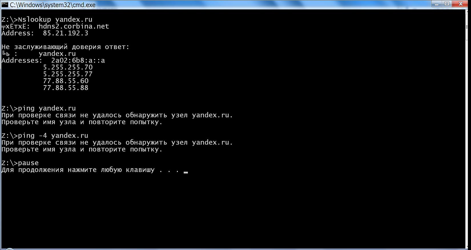 Больше 10 лет моя "Win7 x64 Максимальная" прекрасно работала, но несколько дней назад произошёл непонятный сбой (всё работало, никаких изменений не делалось, выключили ПК, а через несколько часов включили и уже не работало), а именно почему-то перестало работать DNS. Через nslookup айпи получаю. Остальное (пинг и т.д.) ничего не работает. Антивирусов не установлено (но после этой проблемы пробовал Dr.Web CureIt и ещё Касперским 10 системный папки проверил - ничего такого они не нашли). Подключение по витой паре напрямую в сетевую карту компа. (соединение по L2TP... из-за переставшего работать DNS перестало работать срабатывать даже само соединение с интернетом, т.к. там по умолчанию прописано tp.internet.beeline.ru и получаю ошибку 868... но если прописать там айпи, то соединение происходит успешно) На всякий случай переустановил драйвера сетевой карты. Проверил все настройки. Служба Dhcp активна и работает (перезапускать пробовал). Пробовал прописывать альтернативыне ДНС (гугла, яндекса) - не помогло Различные команды по сбросами кэшев и очистки маршрутов (которые иногда помогали в предыдущие годы), здесь тоже не помогли, а именно эти: netsh int ip reset resetlog.txt netsh winsock reset route -f ipconfig /flushdns ipconfig /registerdns ipconfig /release ipconfig /renew http://forum.oszone.net/showthread.php?t=178627 Почитав тему по ссылке выше в том числе пробовал полностью отключать службу Dnscache но тоже ничего не дало. Чтобы окончательно исключить какую-то техническую неисправность (в сетевой карте или т.п.), установил вторую новую чистую винду - там всё работает. Но ОЧЕНЬ бы хотелось реанимировать именно первую винду. ipconfig /all Настройка протокола IP для Windows