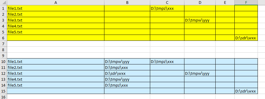 В первой колонке в ячейках стоят имена файлов. И мне надо во вторую колонку поместить полные имена папок, расположенные в других ячейках, чтобы потом приготовить из этих двух колонок код для перемещения файлов в нужные мне папки.