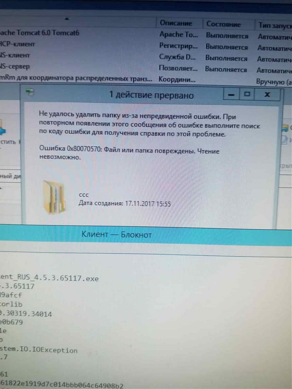 1. Не удаляются файлы и папки с ошибкой код 0х80070570 (скрин прикрепил). При этом если эти же файлы удалять по одному руками - они удаляются.
