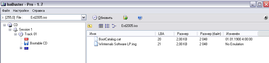 через програмку Iso Buster видна такая картина: в секции bootable CD находится два файла размером по 2048 байт, bootcatalog.cat и Winternals Software LP.img аналогична картина и при просмотре образа BCDW2, только там bootcatalog.cat и BootImage.img ну а в третьем варианте, используемом мною с подменой загрузочного сектора, вообще интересно - названия файлов как в образе ERD 2005, bootcatalog.cat и Winternals Software LP.img , но при посекторном просмотре Winternals Software LP.img там наблюдается начинка BCDW2, вообщем прикрепляю все варианты файлов, может знатоки разберутся ![]() |
