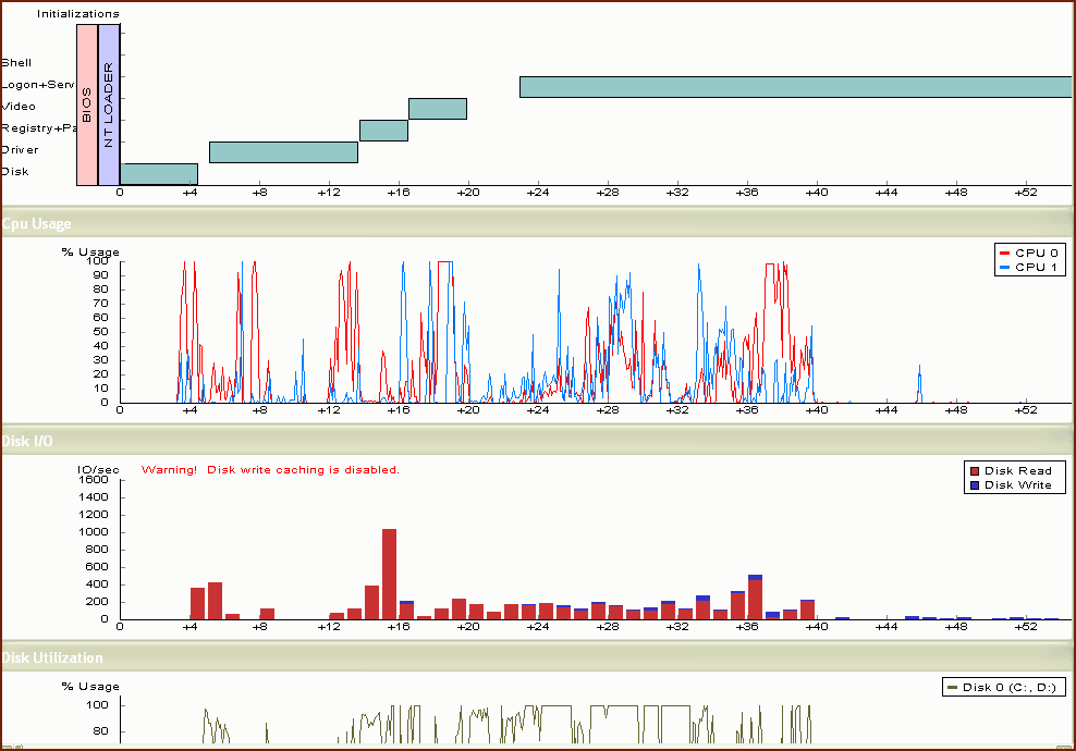 Перевес в градусах между ядрами может быть погрешностью? Полная дефрагментация была правильным решением. К тому же если БутВис выдаёт такие сообщения так и рекомендуется поступать >> На обоих скрине как раз и говорится что может не так Disk write cahing is disabled., кэширование записи диска отключено. >> Как проверку рекомендую создать нового пользователя (не админа и не гостя) и проверить как быстро с ним происходит вход в систему. Назначить ему автологон и перезагрузится. |