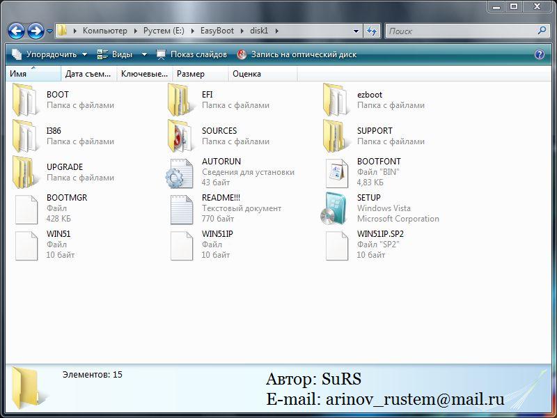 disk1\ \BOOT \EFI \ezboot \I386 \SOURCES \SUPPORT \UPGRADE ...AUTORUN.INF ...SETUP.EXE от VISTЫ или от XP ...BOOTMGR ...BOOTFONT.BIN ...WIN51 ...WIN51IP ...WIN51IP.SP2 ------------------------------------------------------------ Действие №2: В папке ezboot должны лежать только такие файлы! ezboot\ ...BACK.B15 ...w2ksect.bin ...w2ksect.ini ...LOGO.B15 ...LOGO.BM2 ...vistaldr.bin ...vistaldr.ini ...BACK.BM2 ...standard.ctb ...loader.bin ...cdmenu ...BACK.bmp ...LOGO.bmp --------------------------------------------------------------------------------------- Действие №3: Какие вписиваем параметры в файлы w2ksect.ini и vistaldr.ini! w2ksect.ini: \i386\setupldr.bin ; Установка Microsoft Windows XP ; Установка Windows XP vistaldr.ini: \boot\bootfix.bin ; Установка Vista ; Установка Windows Vista --------------------------------------------------------------------------------------- Действие последнее: настраевем команды в EasyBoot! Установка Windows Vista: вписываем: run vistaldr.bin Установка Windows XP: вписываем: run w2ksect.bin --------------------------------------------------- Ну и все! А кто не понял как! скачайте rar_файл ezboot с файлами! ----------------------------------------------------------------- Автор: SuRS ----------- |