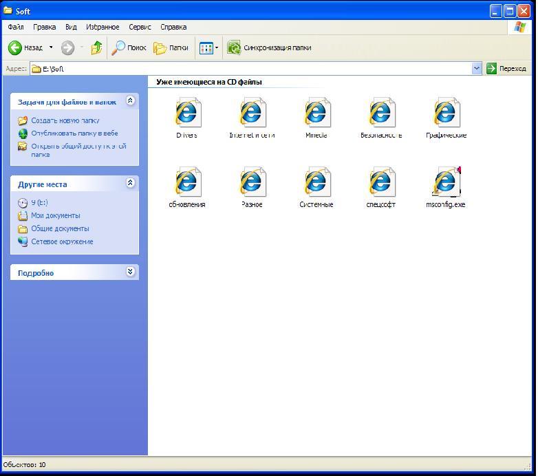 Захожу: Мой компьютер - DVD RW привод - и там вместо папок и файлов значки страниц Internet Explorer ... Смотрите на скриншоте. Если зайти: Мой компьютер - DVD привод - свойства - запись и там убрать галочку "разрешить запись CD на этом устройстве", то все иконки при открытии диска становятся нормальными.. Пробовал удалять диск из системы, не помогло.. Установлено WinXP SP3 + IE7 Винда абсолютно чистая, переустановил два дня назад, никуда не лазил. Чего за хрень-то? Я понимаю ерунда, но меня очень раздражает, когда, что-то не так работает. Раньше никогда такого небыло... забыл добавить: эти значки IE не вместо иконок обычных, а над ними ка бы.. т.е. за ними видно стандартные иконки.. и когда открываешь диск, сначала все появляется нормально, а через секунду закрывается значками IE |